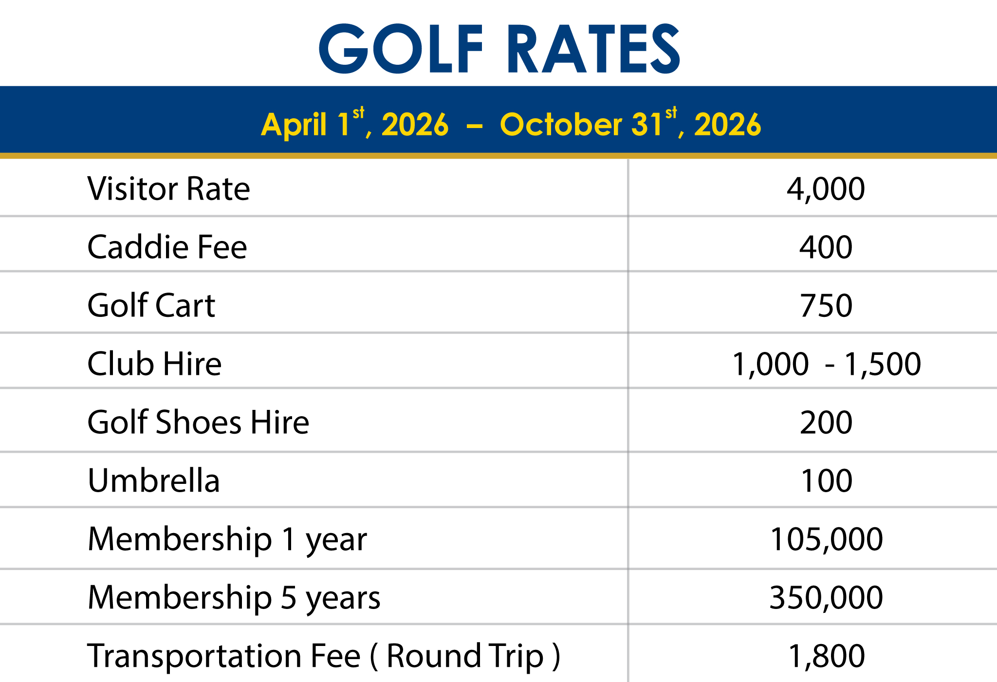 ALL RATES IN THAI BAHT UNLESS OTHERWISE STATED - Golf Rates unless otherwise noted above are based on 18 holes at the Chiangmai Highlands Golf and Spa Resort golf course - rates do not include Caddie Fee of 400 THB per round this fee is compulsory and must be paid in cash. There is a Traditional tip for the caddie per 18 holes a good tip is generally 400 THB upwards. The Green Fees do not include any cart fee of 750 THB per round one player per cart and caddie must drive. Depending on weather and golf course conditions on the day and / or during the round golf carts MAY be allowed on to certain parts of the fairways at 90 degrees - on and off the cart path. All rates are per person including golf and are quoted in Thai Baht and include the taxes as charged by the Thai Government at the time of writing. The rates are subject to change without notice. The Chiangmai Highlands Golf and Spa Resort does not operate a Rain-Check policy.